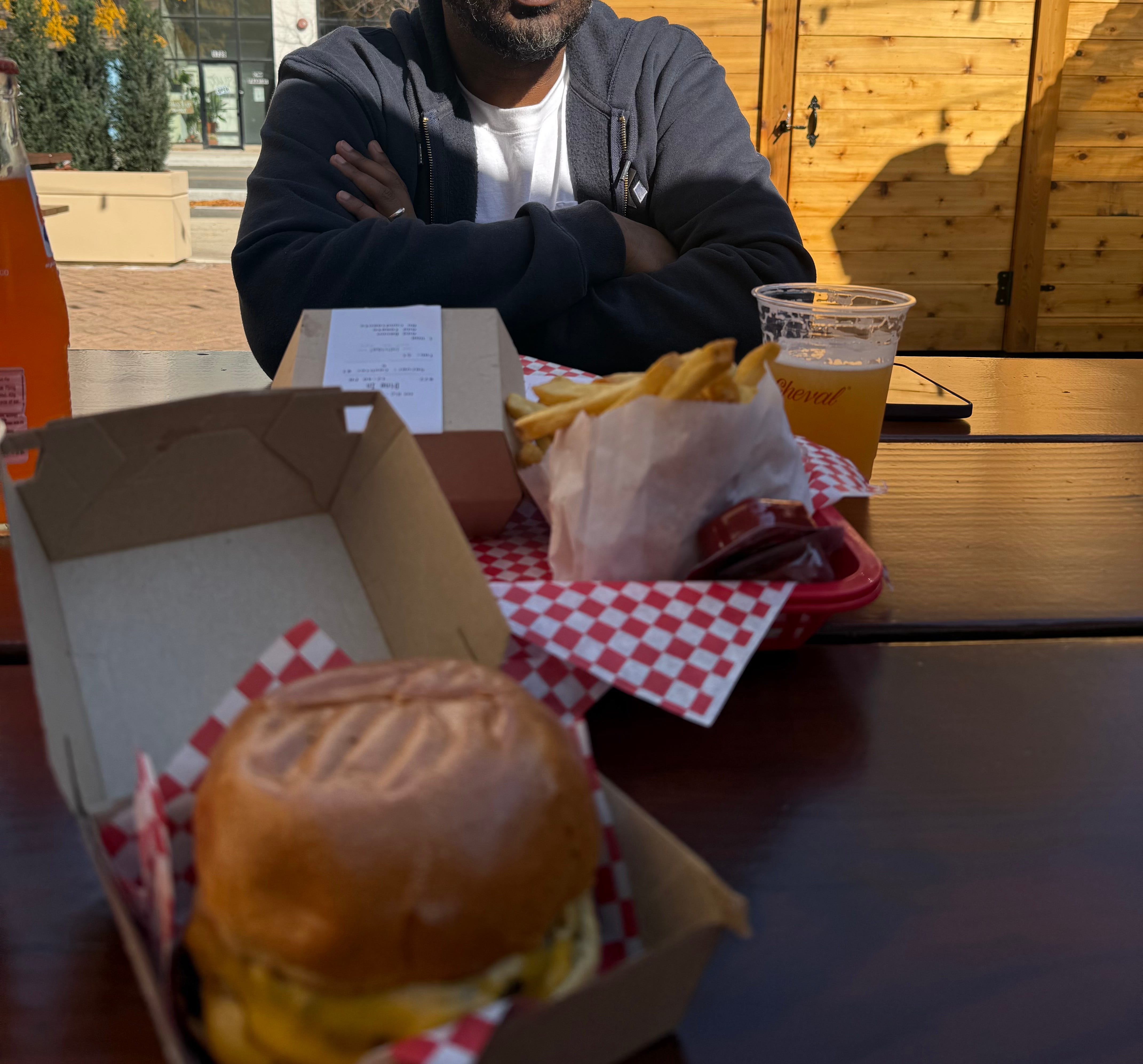 We are greeted with a simple menu with few options and place our orders. I got a cheeseburger with whatever the special sauce was, and my husband got a plain burger, maybe with tomato on it, though I can’t remember. We order fries and I pick a local beer from the menu.