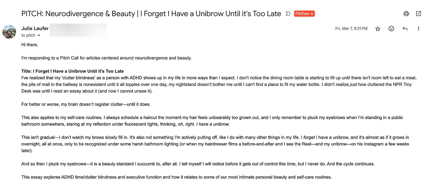 For this particular essay, which ended up being about a unibrow, I answered a pitch call that originated on LinkedIn. The pitch asked for stories about how neurodivergent traits intersect with self-care and beauty. I looked down at my keyboard and glanced at my picked-at cuticles and started writing a pitch about a lifelong nailbiting habit.