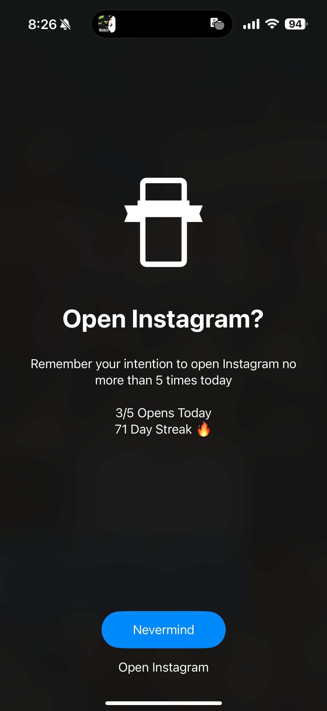What I liked about this app is that I could set limits on specific apps and say things like “I will open Instagram five times a day, for five minutes at a time.” Every time I would go to open Instagram, I was faced with a screen reminding me that I committed to only open the app five times, and this would count as one of them. Just that in-your-face reminder, that “hey this is allowed, but is it worth it,” and having to opt in to opening the app was more powerful than I think I realized.