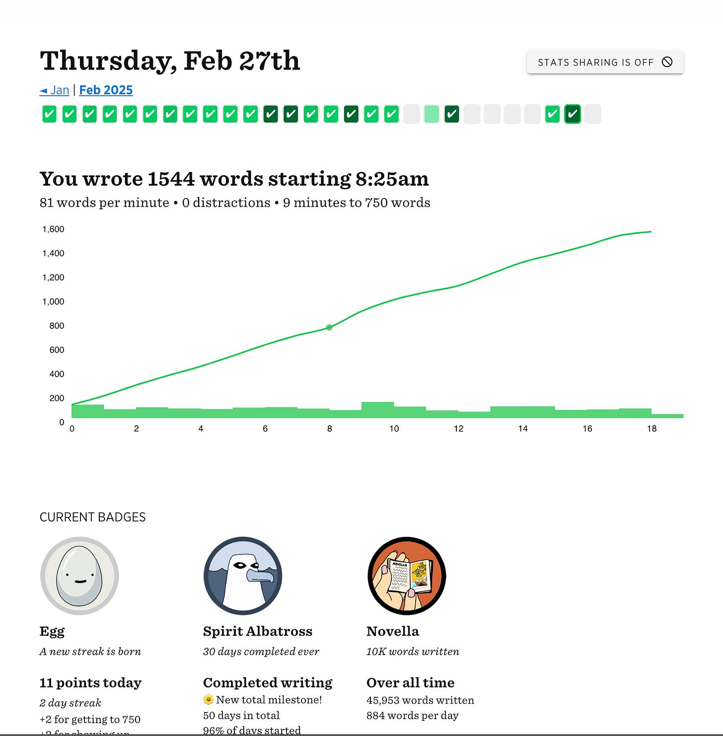 The mission: helping people get into—and stick with—a daily journaling habit. It’s simple — a blank page appears every day, counting the number of words typed. At the end, a little confetti celebration appears, and with that a habit is born. Before this, I was writing for about 10 minutes a day, and that totally works too. But there is something about having a dedicated space to focus on writing that I find really helpful. After a generous 30-day trial, I tried to continue on my own in my own word processor and just found it wasn’t sticking the same way. So, I've been shelling out $5/month and so far, so good.