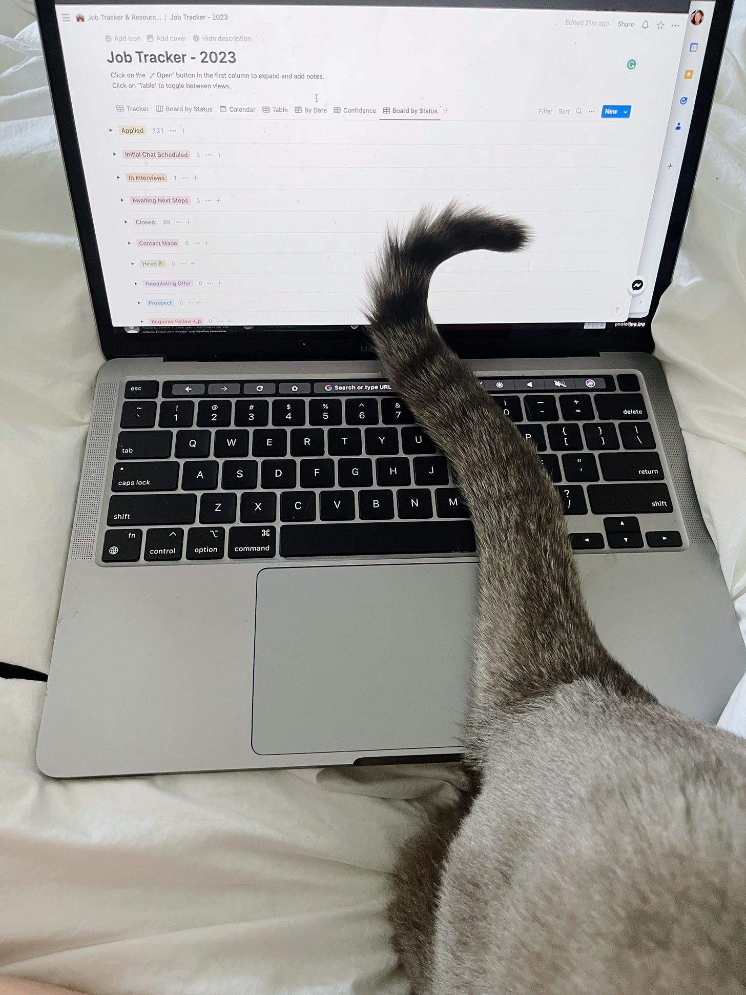This will be a short one—I first became curious about how my job search was progressing and started looking at the numbers in my job tracker (Notion template here, if this is your thing), and thought it would be fun to share these a bit more broadly, as well as some other numbers from this month in general. So without too much pomp and circumstance, here are some numbers (as of 4/18/23) 🤓: