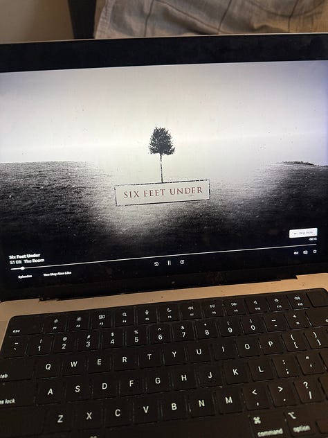 A warm up compared to the day I had planned, but again — I was done. I watched more Six Feet Under, read more of my book, and my husband and I went out to dinner again.